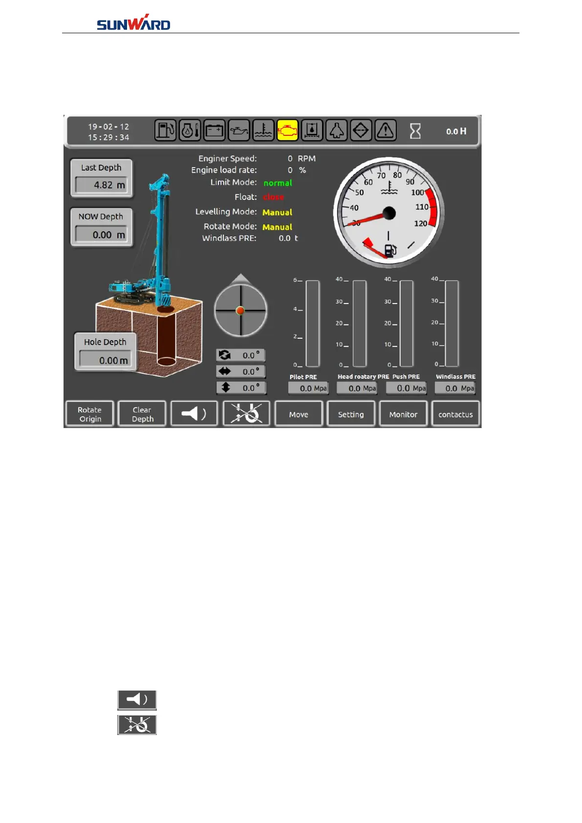 depth, drill tube depth, water temperature, engine speed, engine load rate, limit mode, the