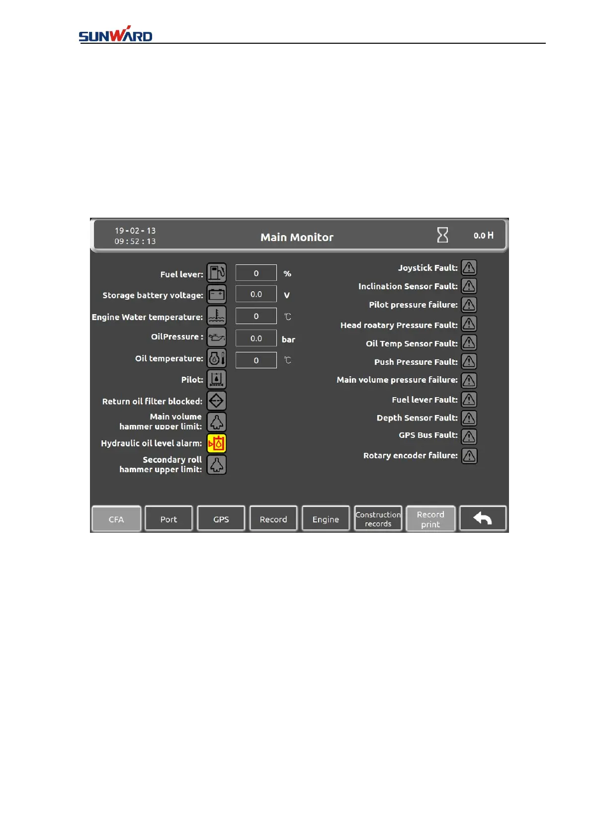 All the conditions of sensors and equipment alarms are displayed in this interface: when the