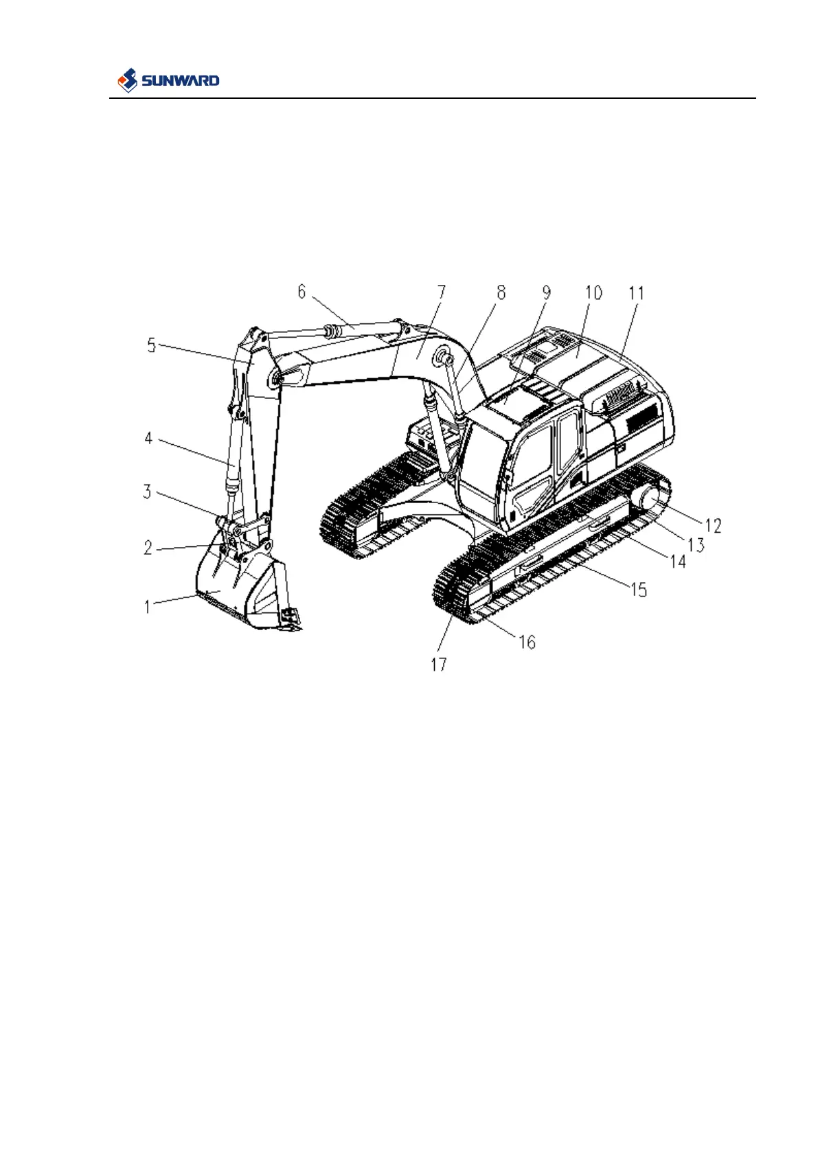 9.Cab 10. Engine hood 11. Counterweight 12. Travel motor