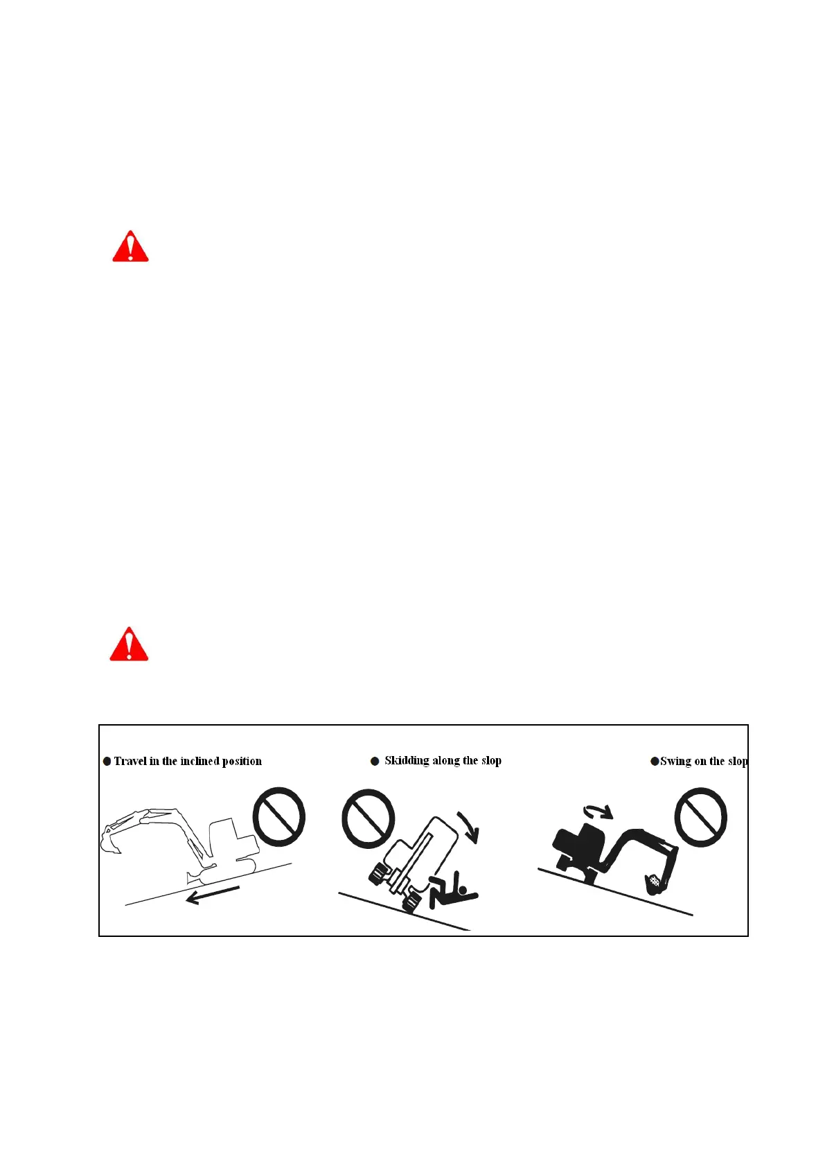 travel or swing on the slop, it will tip. The following operation is dangerous, don’t operate the