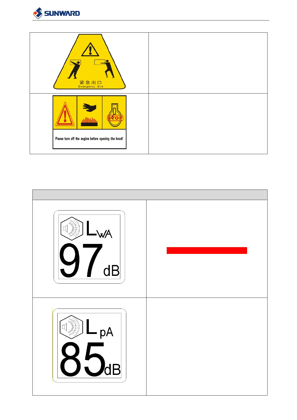 The following table shows the different acoustic labels fixed on the machine and the respective