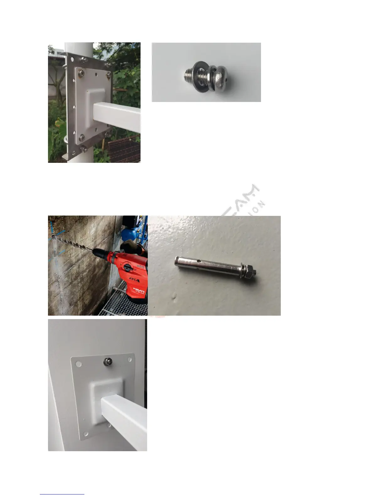 Drill 6 holes on the wall, then put the blasting screws inside. Align the bracket holes with blasting screws, and lock