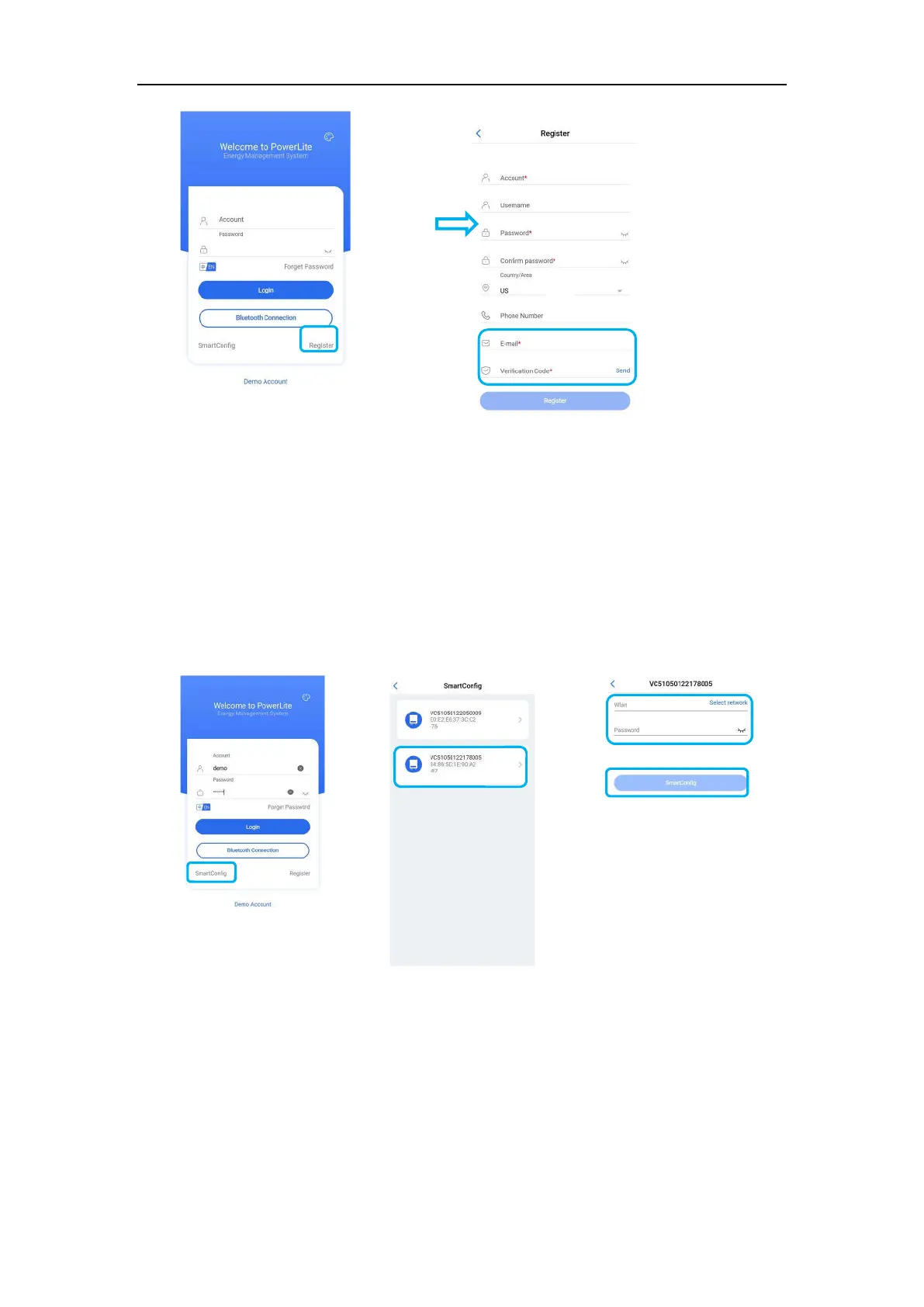 ①Click "SmartConfig", ②Select the Bluetooth device corresponding to the battery, ③Enter the