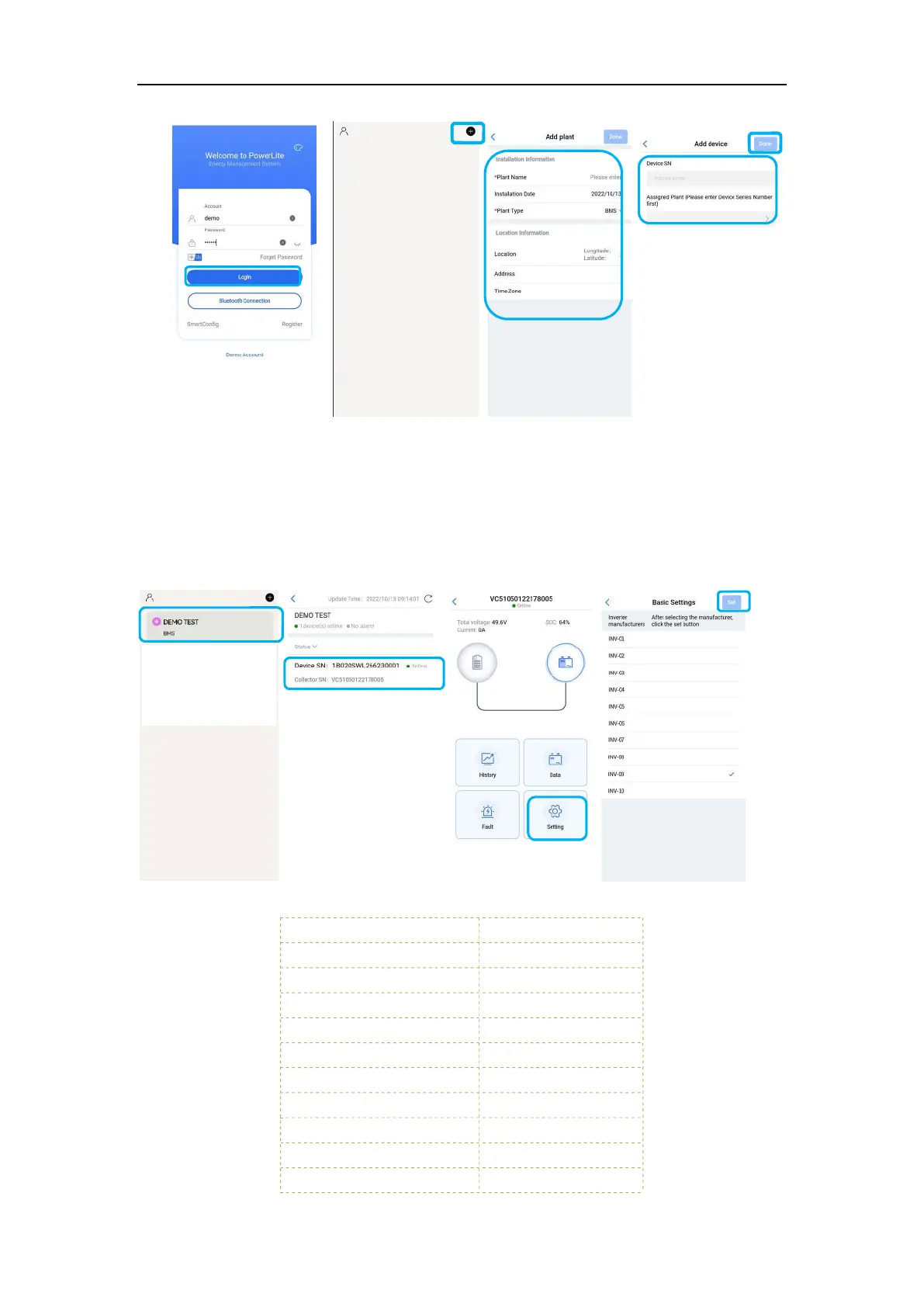 data, ③Click “Setting” to enter the inverter manufacturer interface for selecting the battery