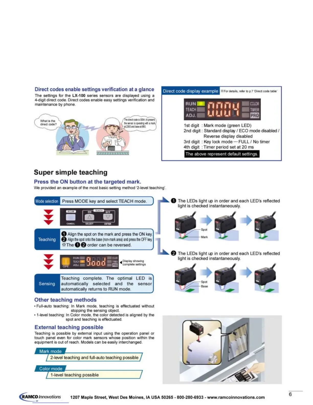 Sunx LX-101 - LX-100 Settings and Teaching; Direct Codes for Settings Verification; Simple Teaching Methods
