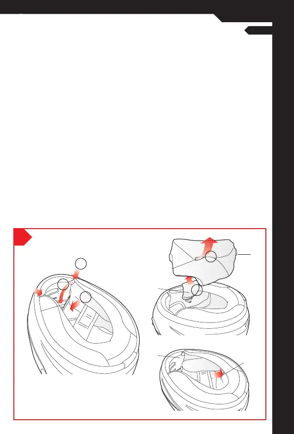 hacia el interior hasta extraerla completamente de la mentonera. Tirar de la almohadilla hacia la parte delantera del casco