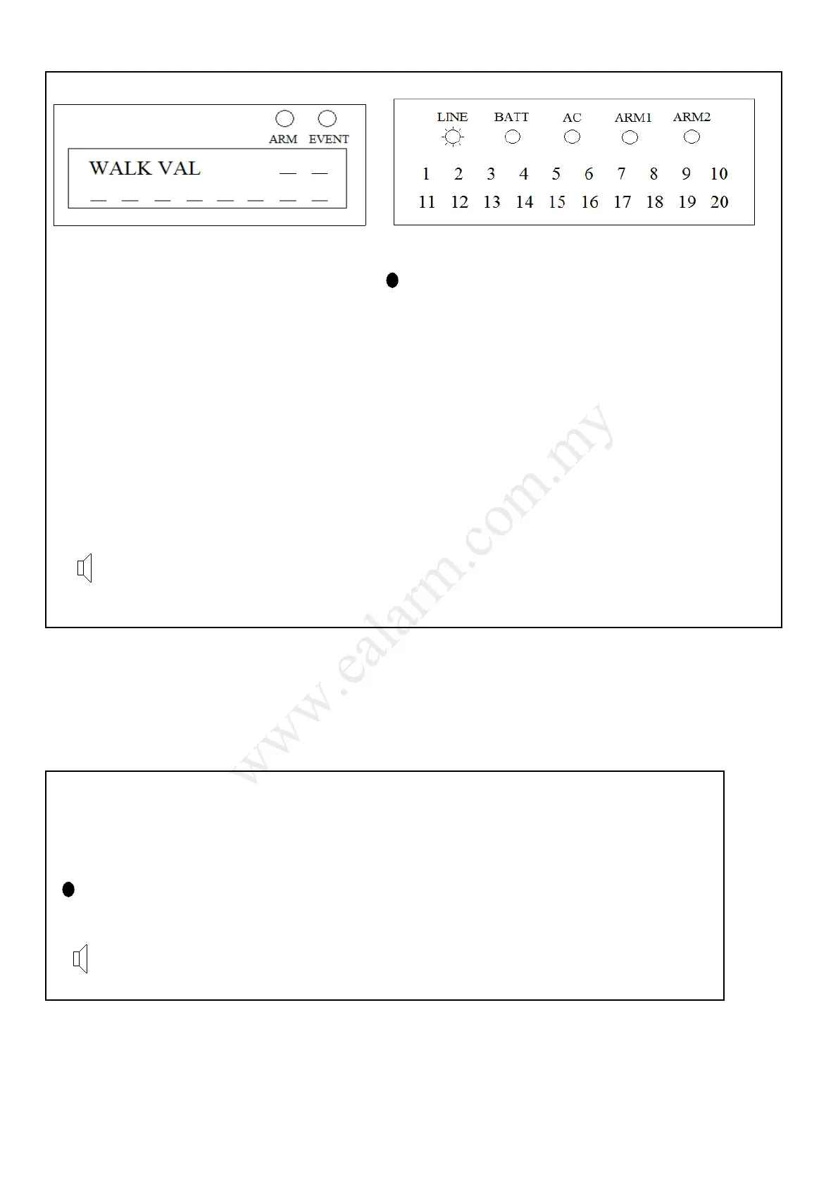 • Walk-test allows all zones, siren and strobe to be tested for functionality. Perform Walk-test periodically to