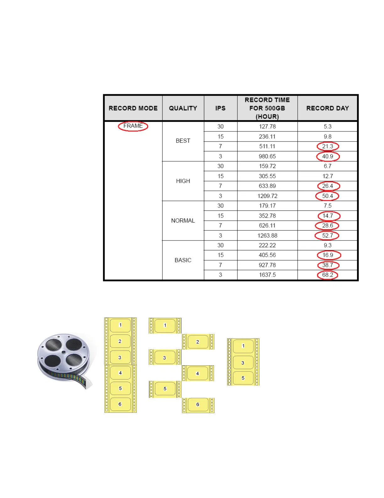 EXAMPLE: Setup a DVR to record for 14 days using the FRAME RECORD MODE. Go to table 1 and you will see 10