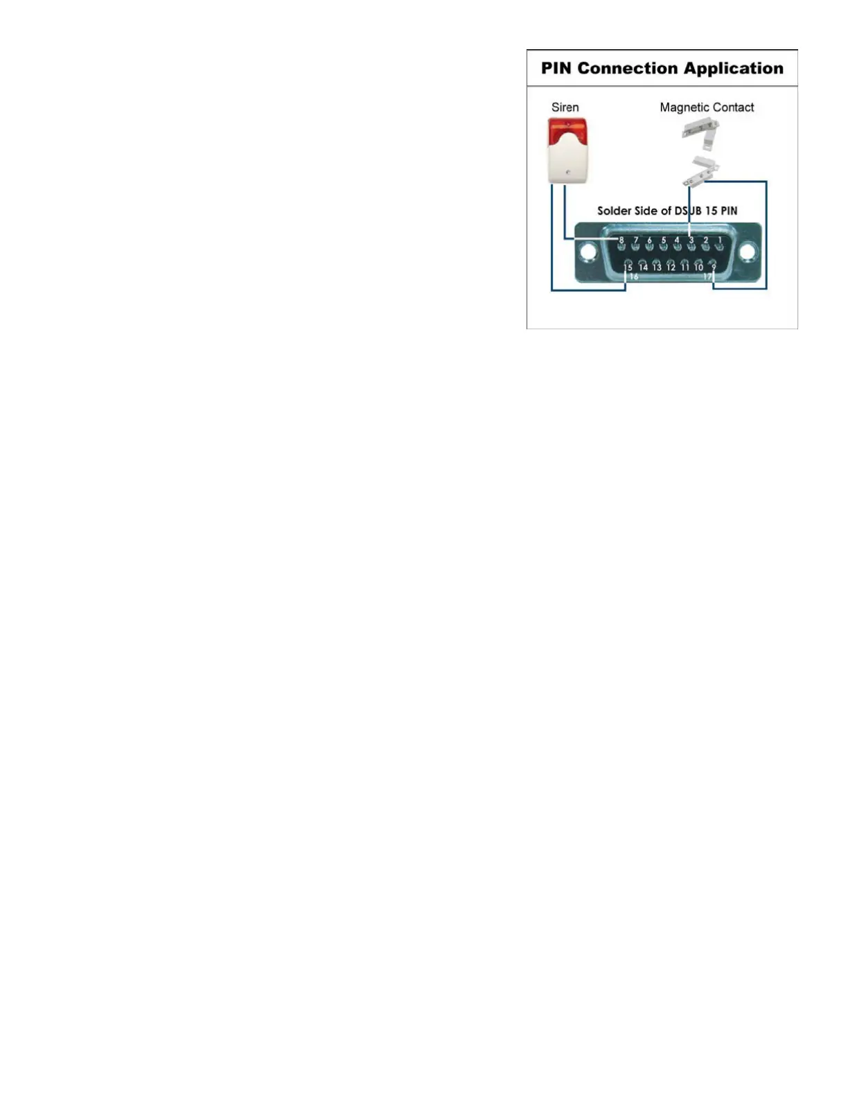 Connecting Input Alarm devices - example using a Magnetic Contacts: Use pins 3, 6 inputs and 9 Signal Ground