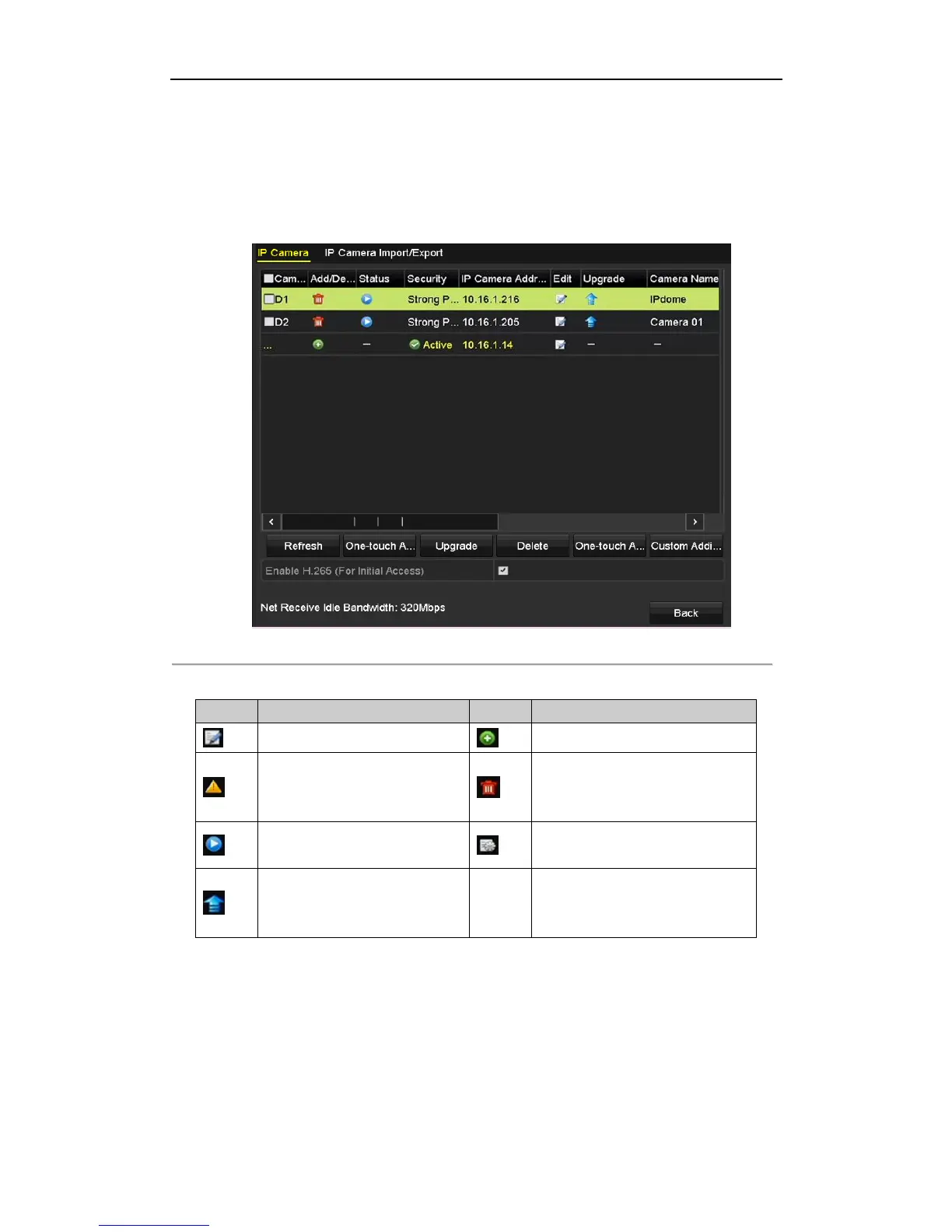 After the adding of the IP cameras, the basic information of the camera lists in the page, you can configure the
