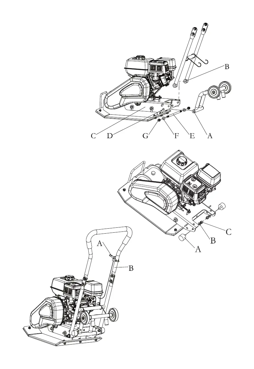 Place the wheel set (A) and handle bracket (B) on the inside and outside