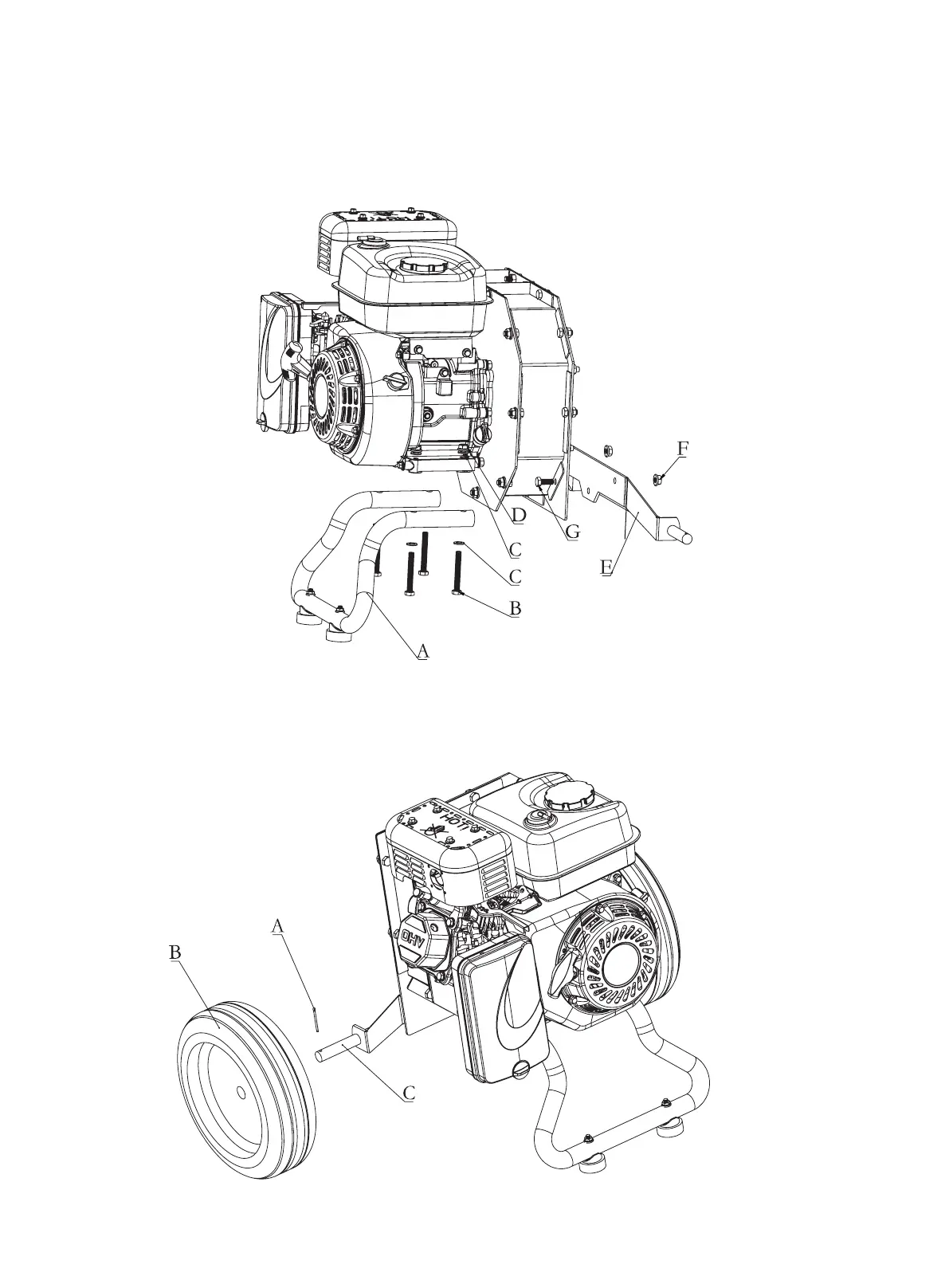 1. Put the wheel (B)onto the axle(C), Make sure the wheel disc flat side face to machine.