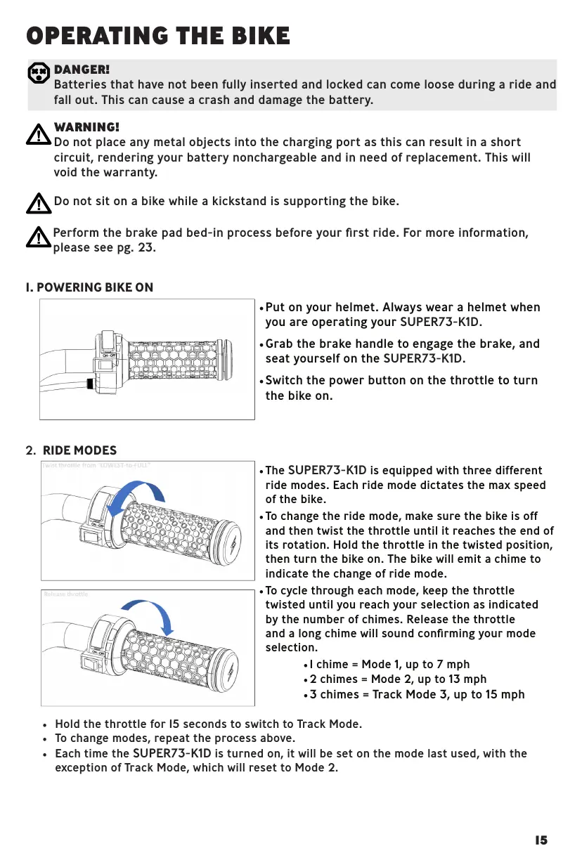 • Each time the SUPER73-K1D is turned on, it will be set on the mode last used, with the