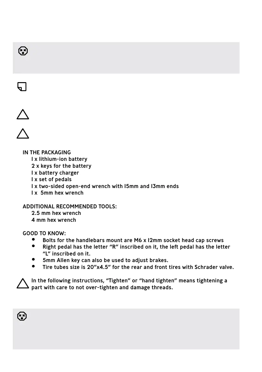 • Bolts for the handlebars mount are M6 x 12mm socket head cap screws
