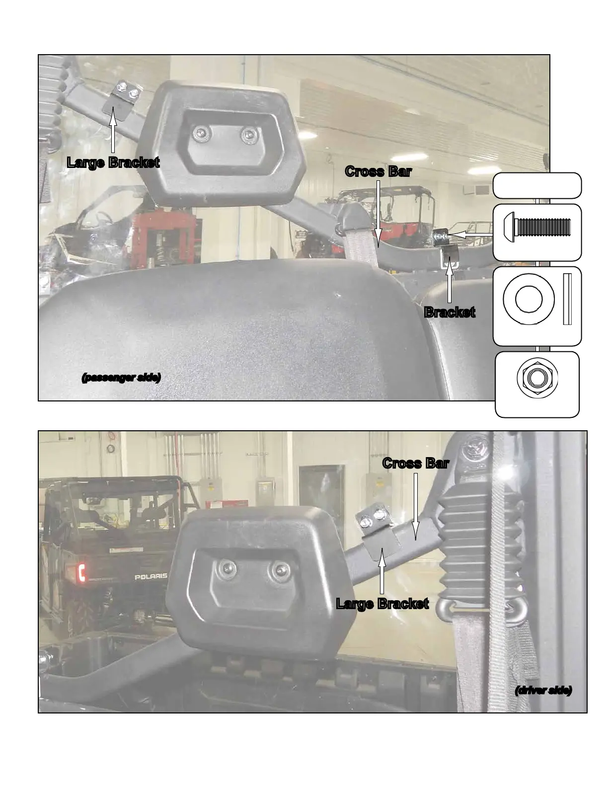 - Install to machines Cross Bar and secure Large Brackets with hardware shown.
