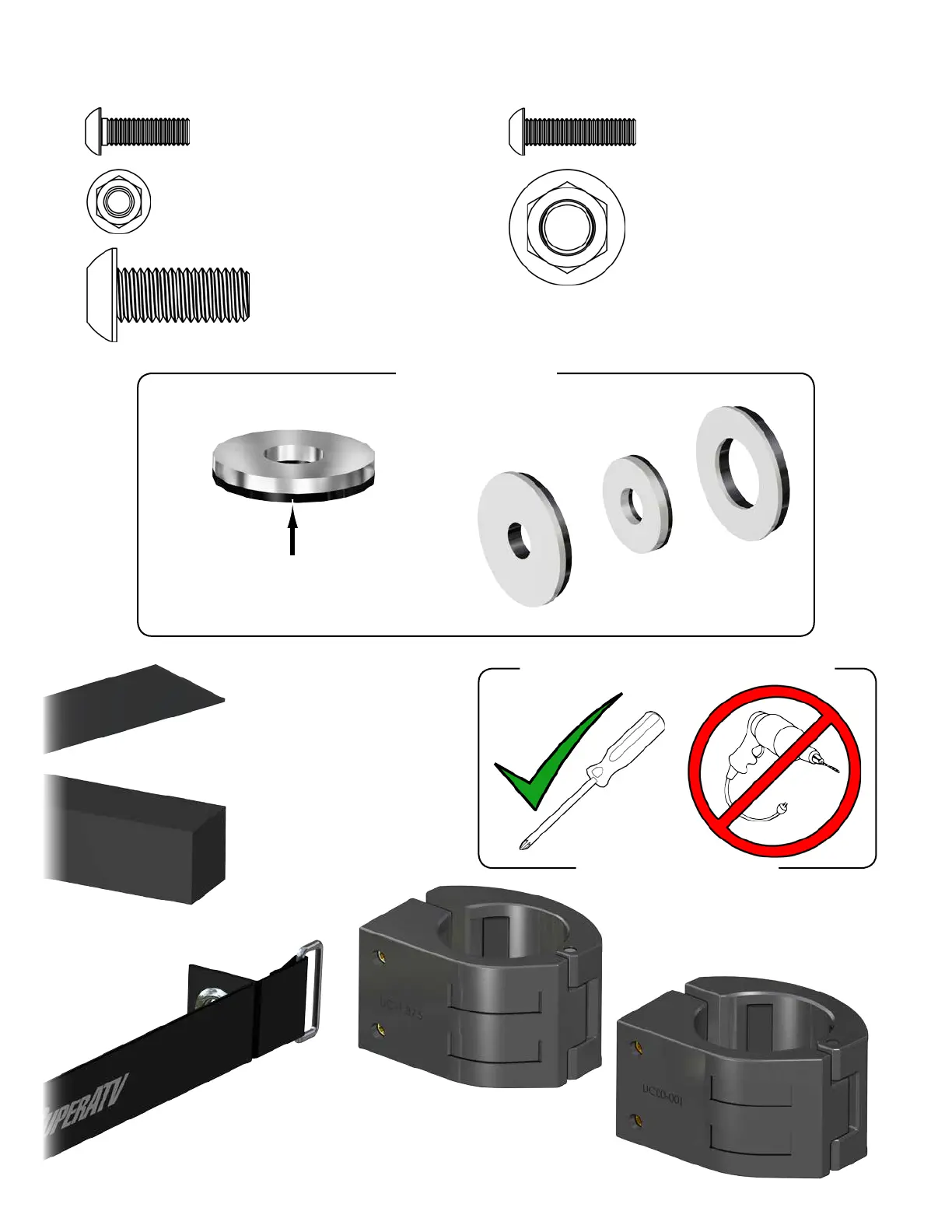 When installing components, do not tighten any hardware completely unless noted.