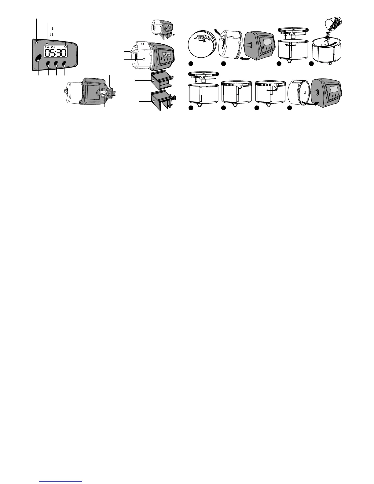 diese Taste verwenden, um den Futterautomaten zu testen und die Menge des Futters anzupassen.