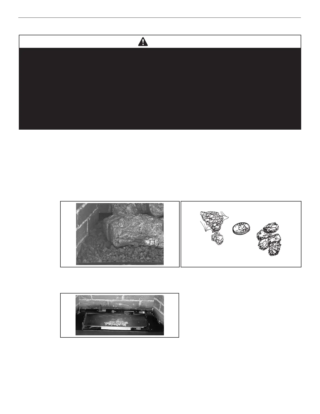 • Turn OFF all gas and electricity to the appliance before installing the volcanic stone, embers, and logs.