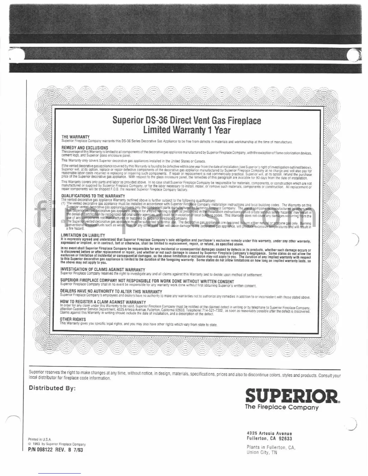 SUPERIOR FIREPLACE COMPANY NOT RESPONSIBLE FOR WORK DONE WITHOUT WRITEN CONSENT