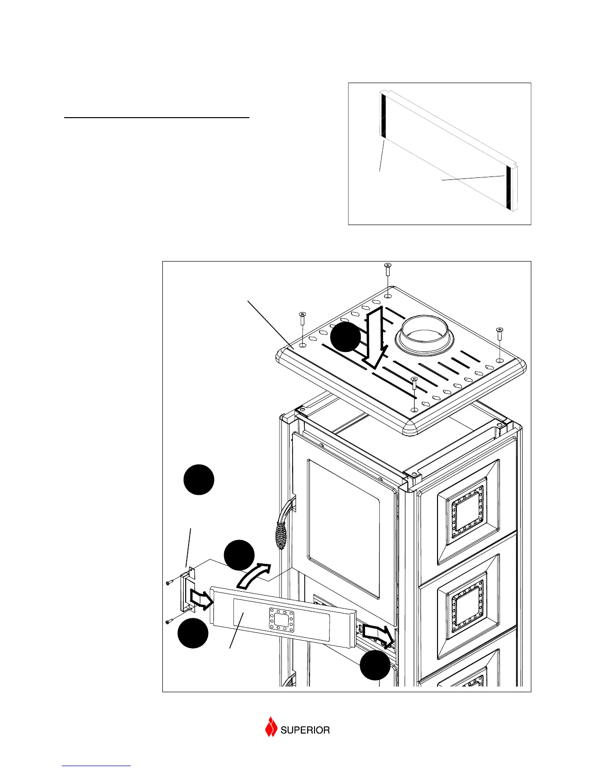 5) Svitare dalla stufa una staffa fissaggio (1), infilare nell’altra il frontalino (2) e con cautela inserire (3) e riavvitare