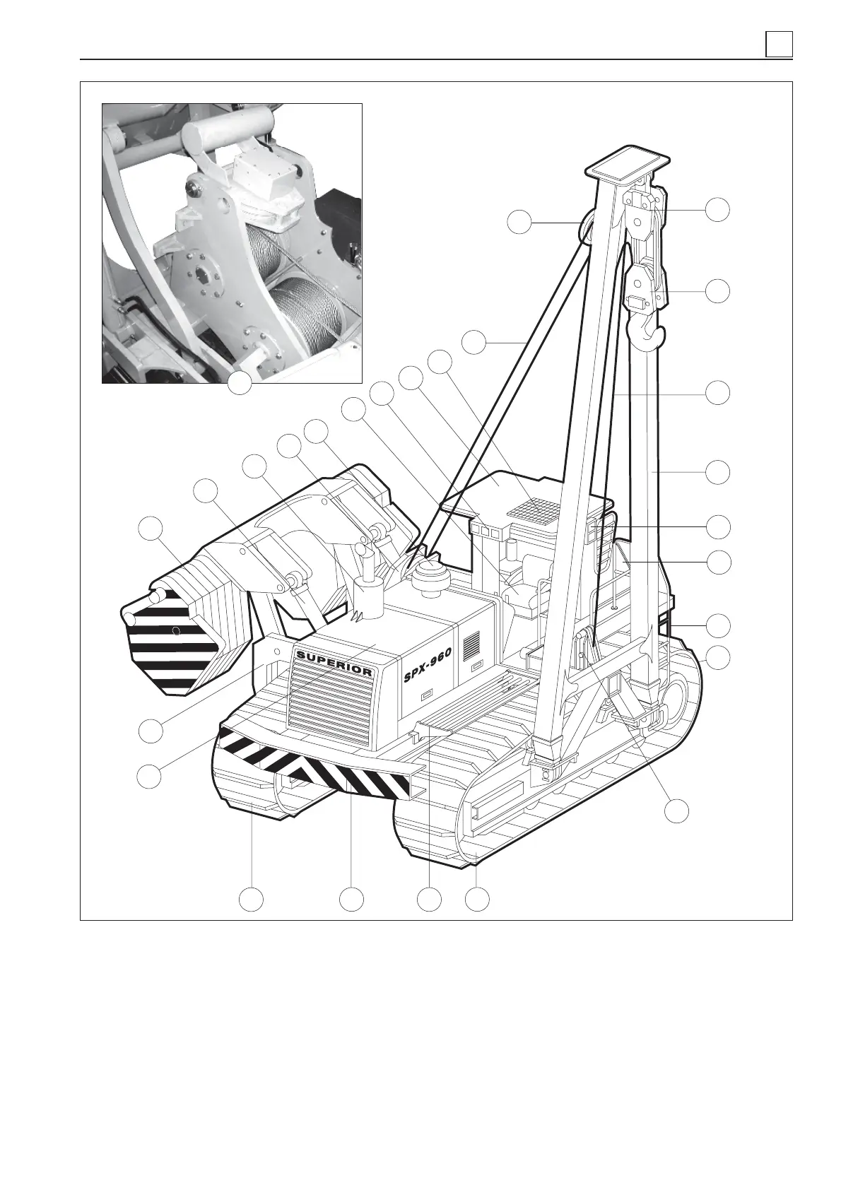 17) Side lights - 18) Hydraulic oil/diesel fuel tank. - 19) Steps for climbing up/down cabin (removable) - 20) Pulleys