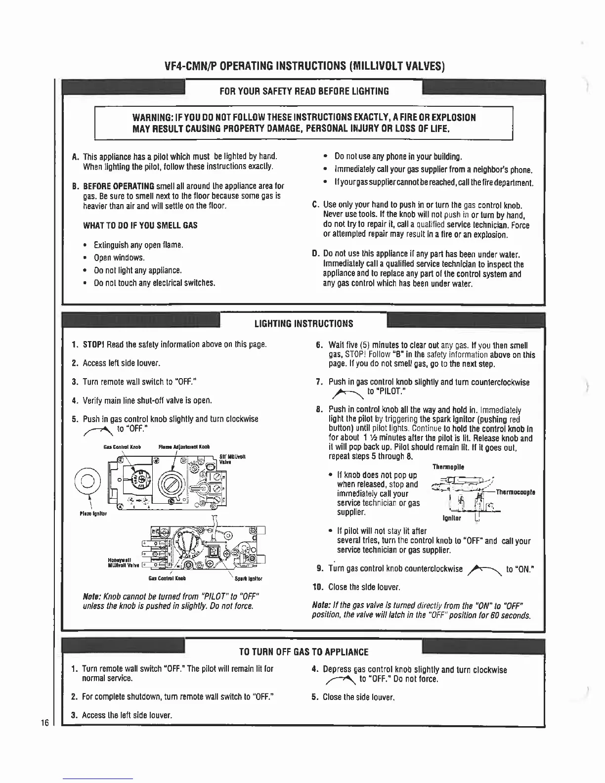 Superior VF4-CHP - Operating Instructions for Millivolt Valves; To Turn off Gas to Appliance