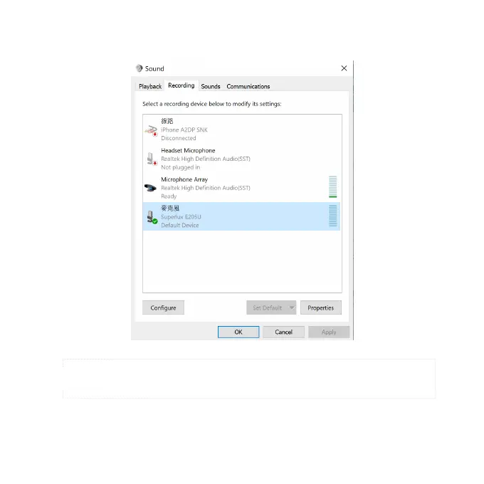 *Notice: If there is already the green tick next to the E205U microphone symbol and the “Set Default” button is not able
