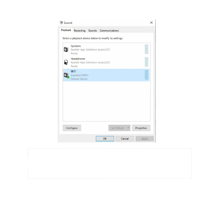 hit (dark gray color), the Superlux E205U has been selected as the default device successfully.