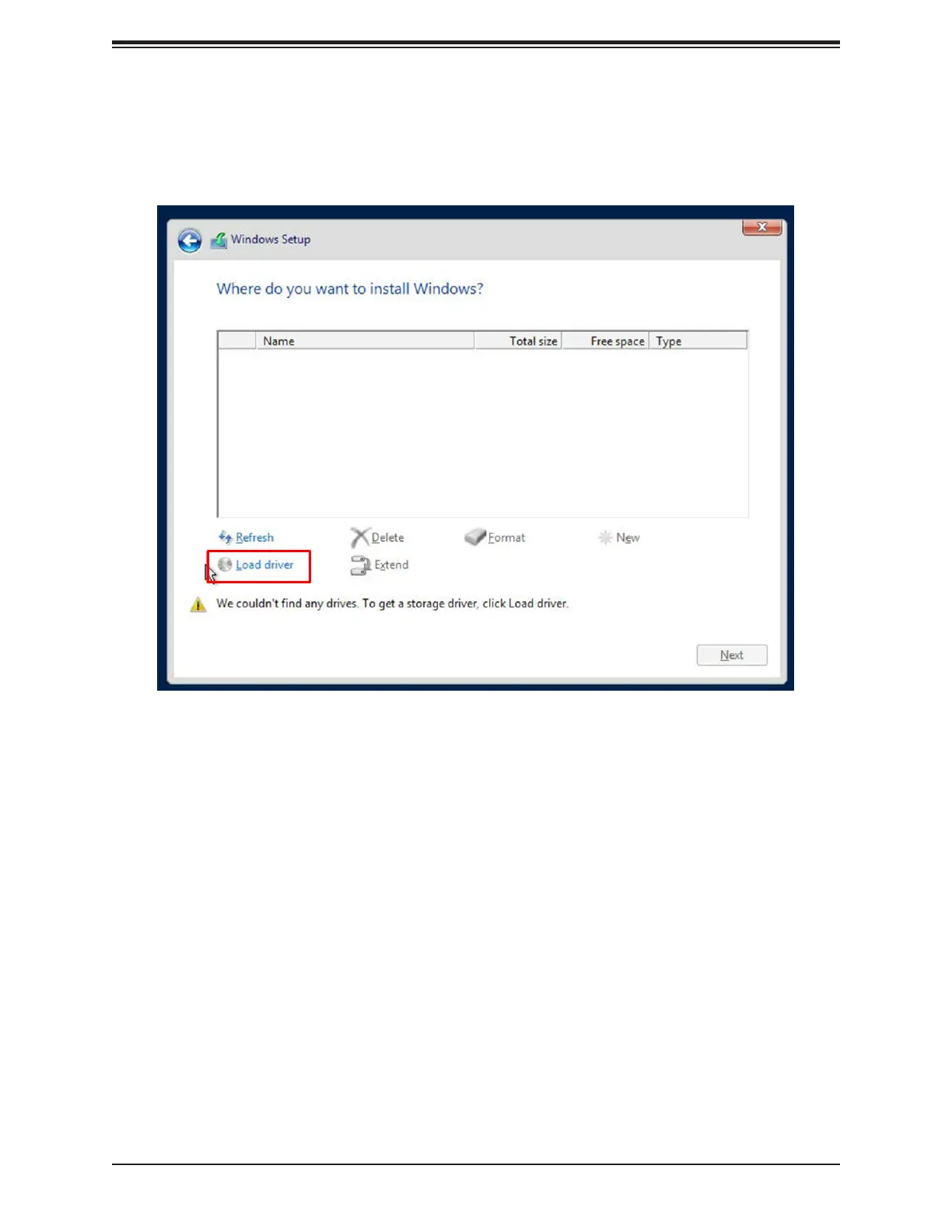 4. During Windows Setup, continue to the dialog where you select the drives on which to
