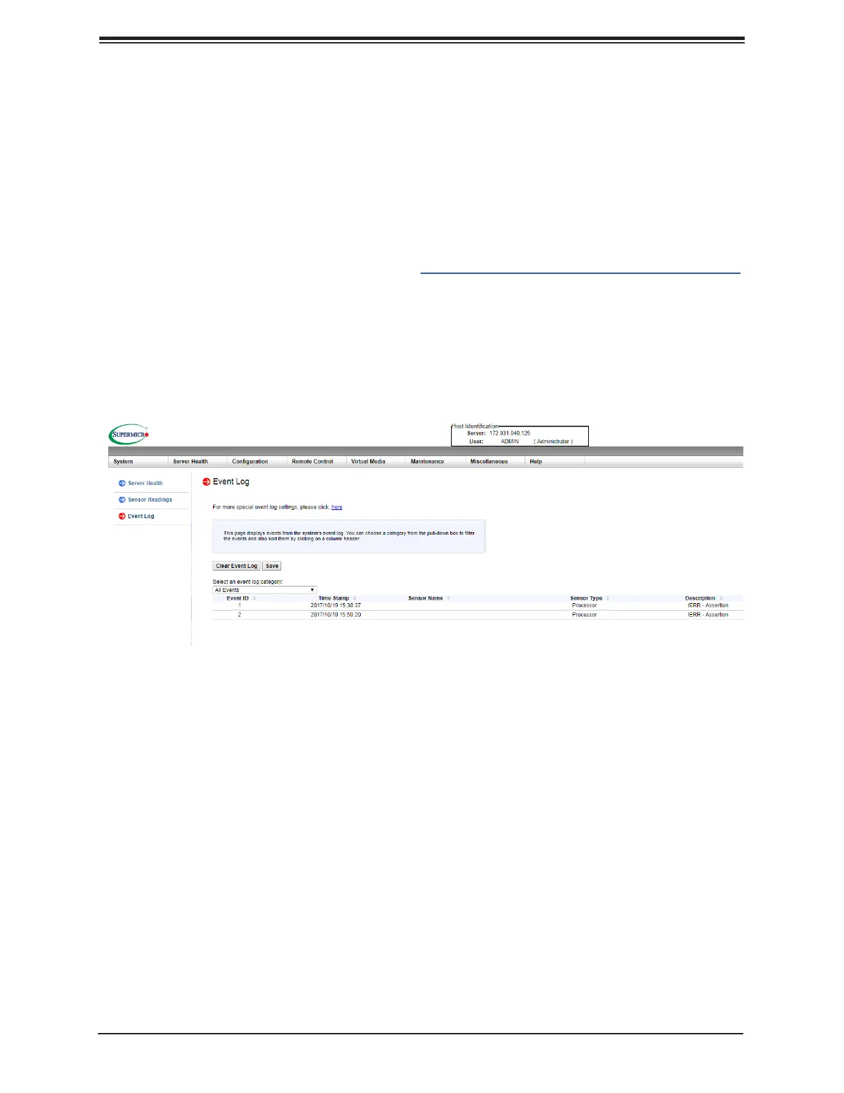 2. Click the Server Health tab, then Event Log to verify an IERR error.