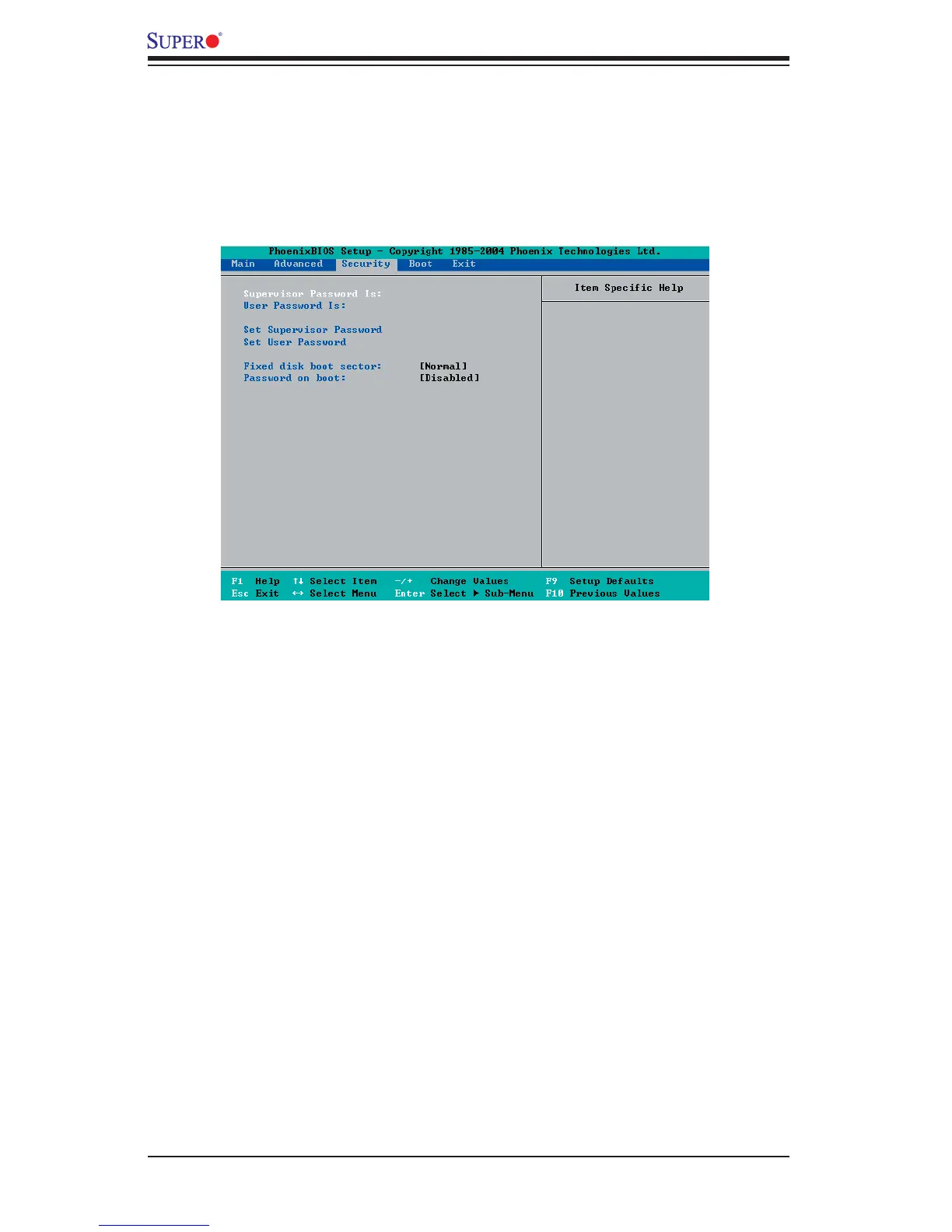 highlighting the setting using the arrow keys and pressing <Enter>. All Security BIOS