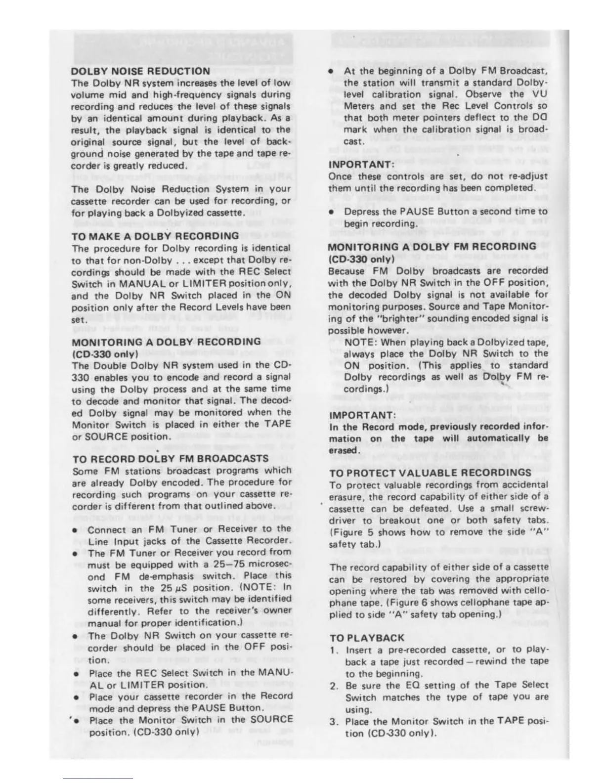 Superscope CD-330 - DOLBY NOISE REDUCTION; Dolby Recording Procedure