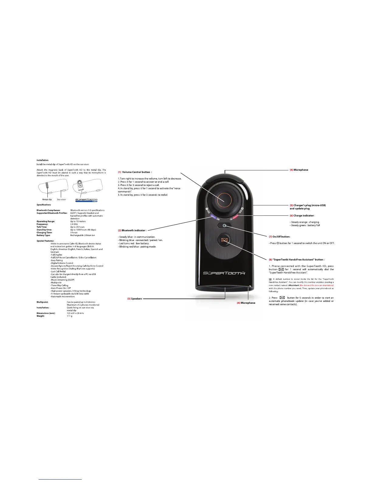 SUPERTOOTH HD - Installation Guide; Device Placement; Device Components and Specifications; Button Functions