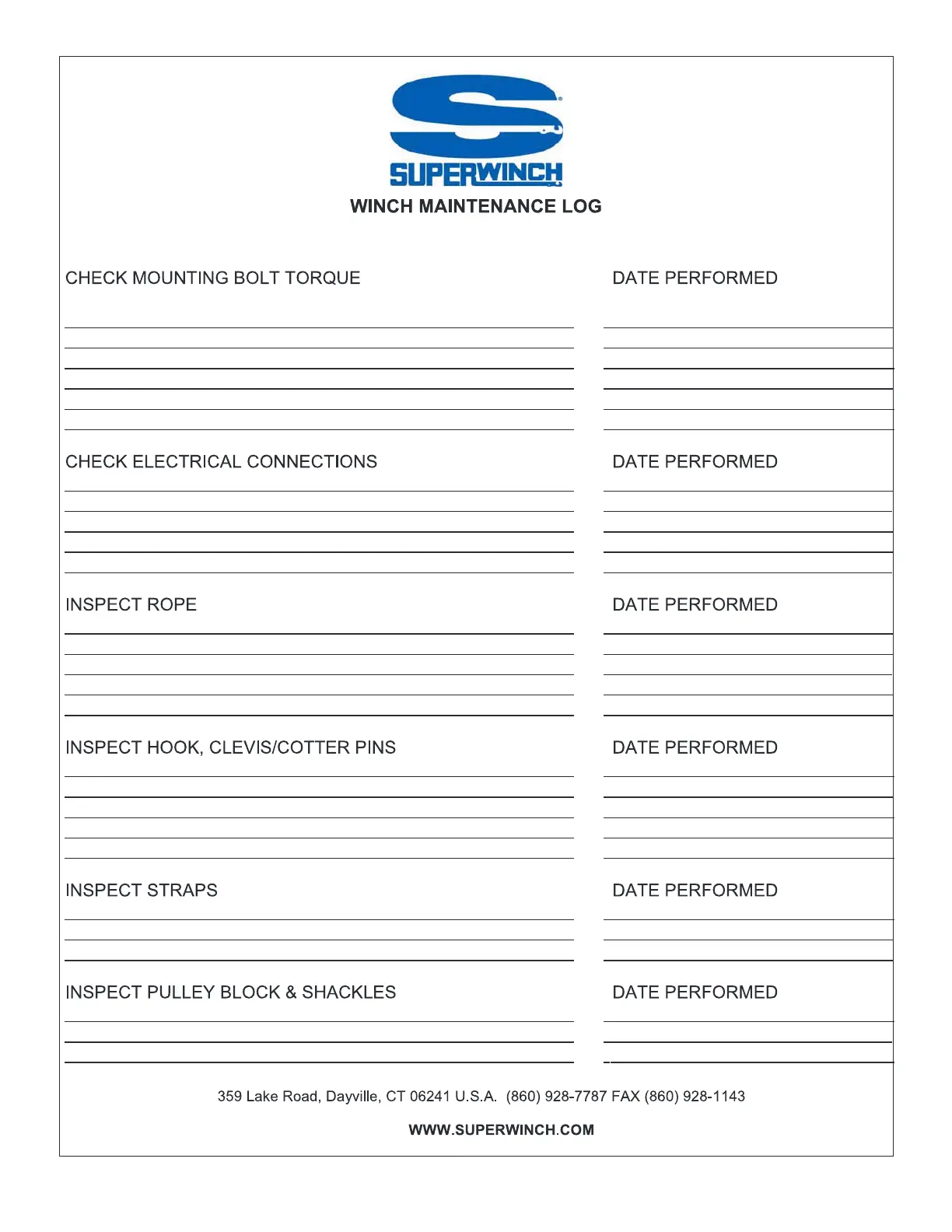 Superwinch S5500 - Winch Maintenance Log