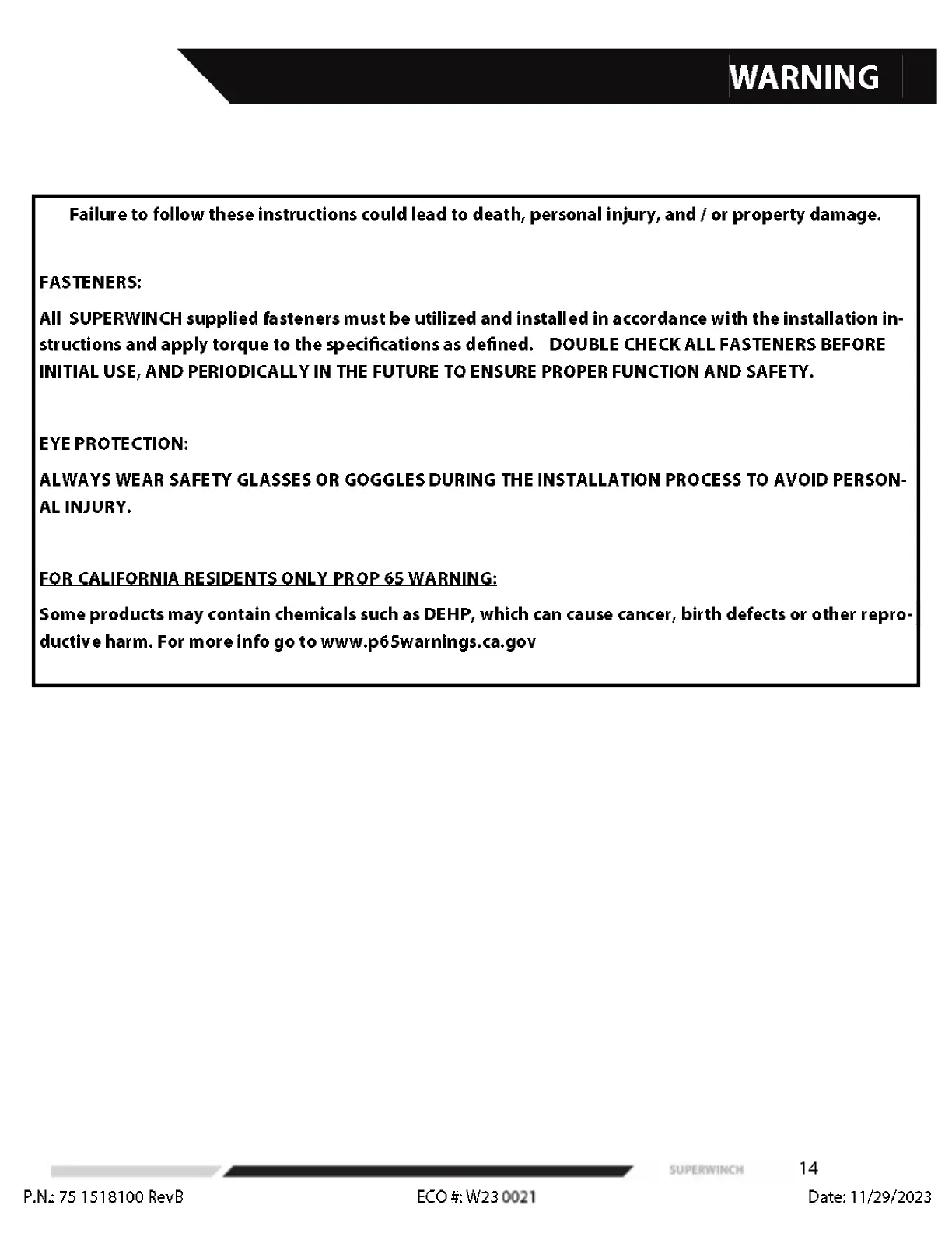 Superwinch TIGER SHARK - Warning; Fastener and Eye Protection Guidelines; California Proposition 65 Warning