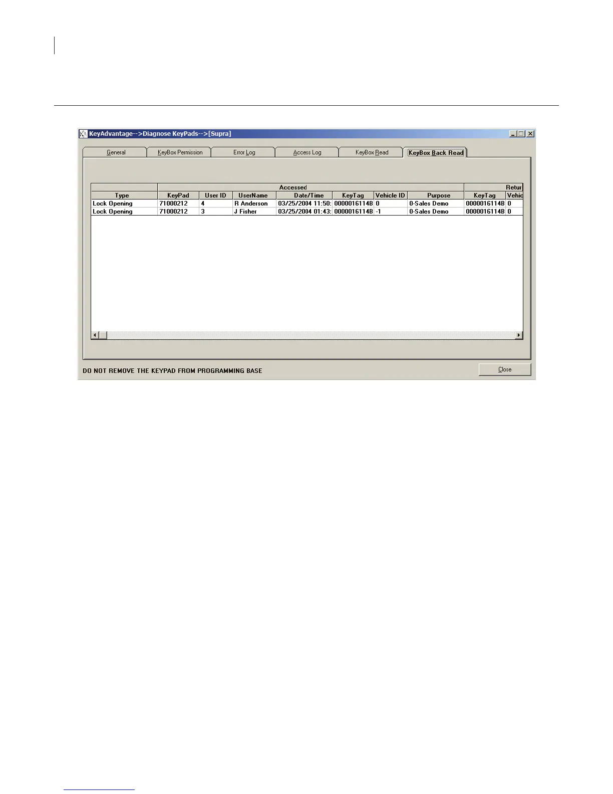 • The KeyBox Back Read tab (Figure 28) displays KeyBox access information stored in the KeyPad. Each