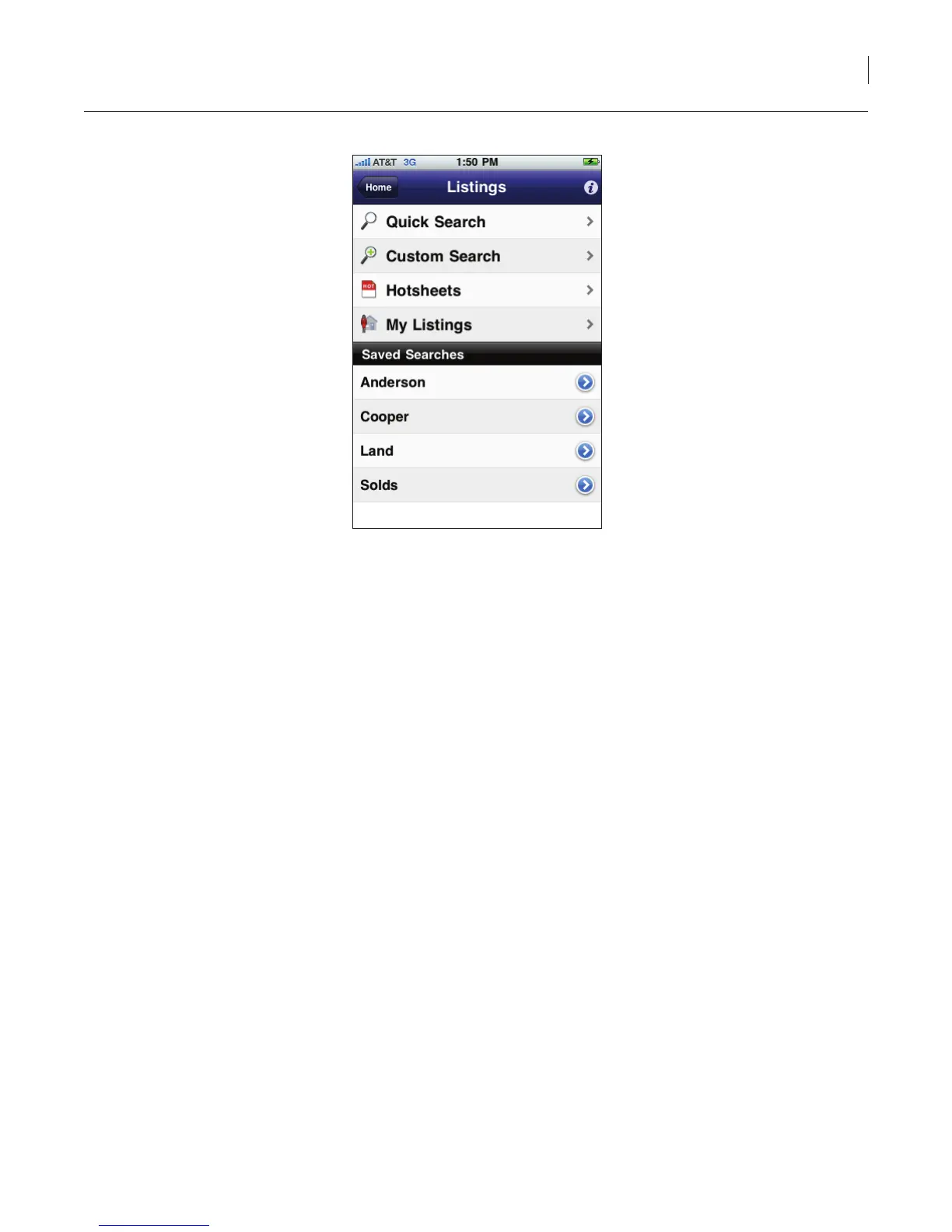 2. Select the Listings icon. The list of saved searches you have created is displayed.