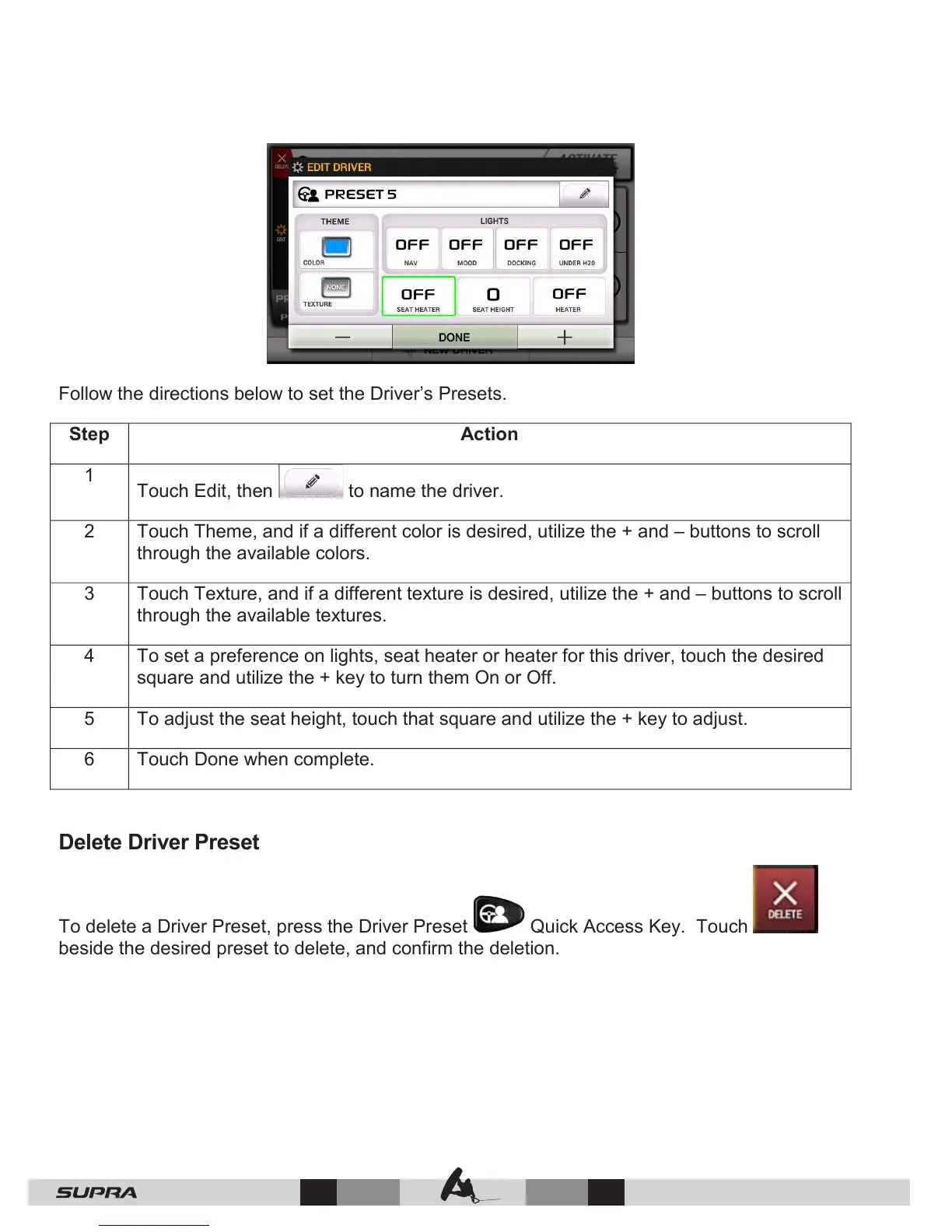 To delete a Driver Preset, press the Driver Preset Quick Access Key. Touch