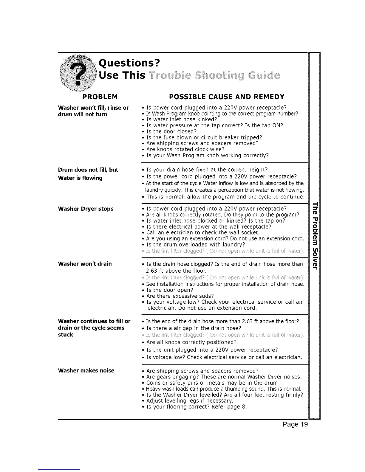 • Is the Washer Dryer levelled? Are all four feet resting firmly?