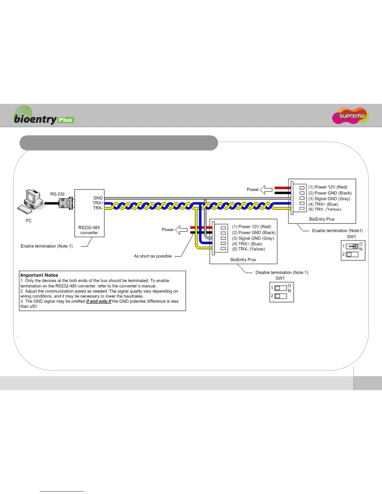 suprema bioentry PLUS - RS485 Host Communication; RS-232 to RS-485 Converter Setup; RS485 Termination and GND Notes