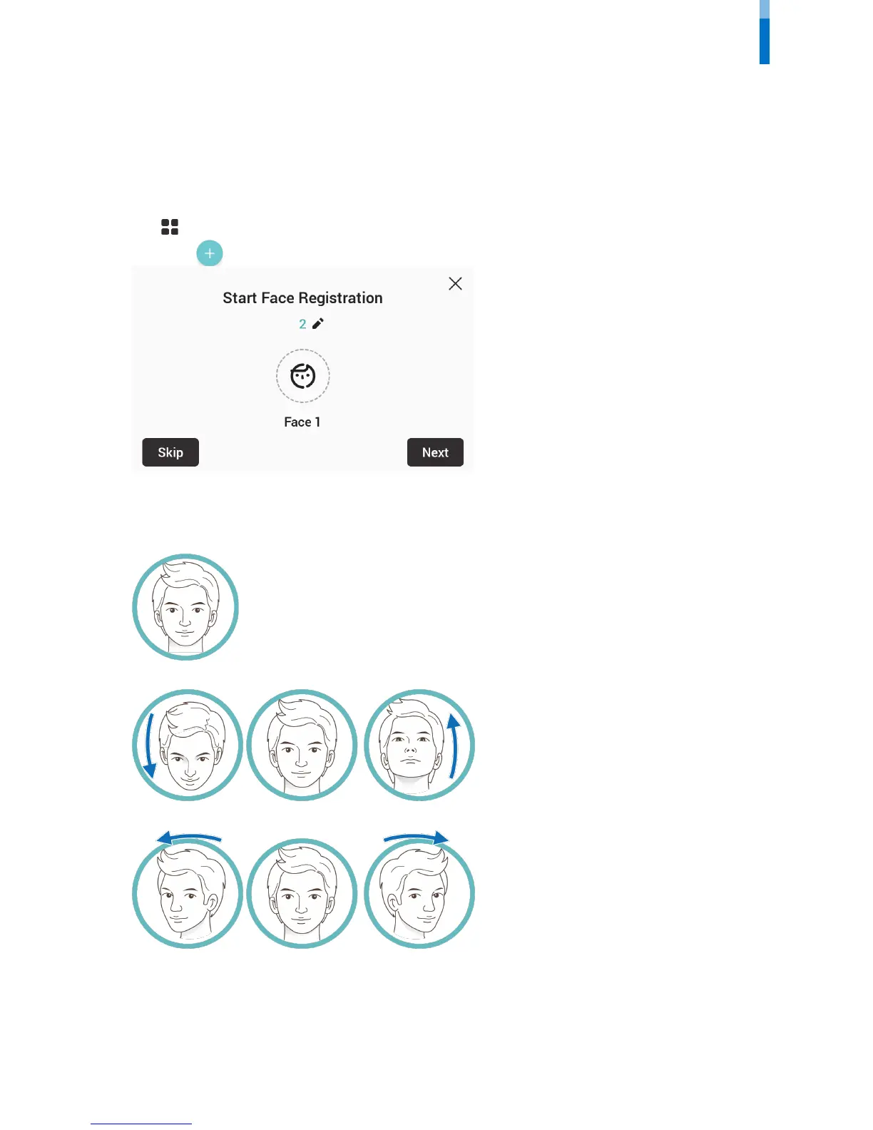2 Press User > . The face registration wizard will begin.