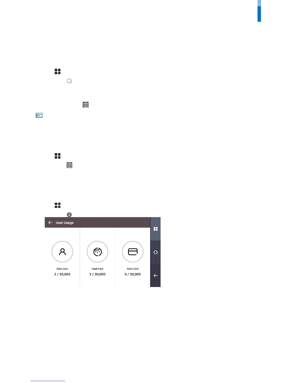 User Management or Administrator can modify the registered user information. A user’s face or card can be added, and the PIN and level