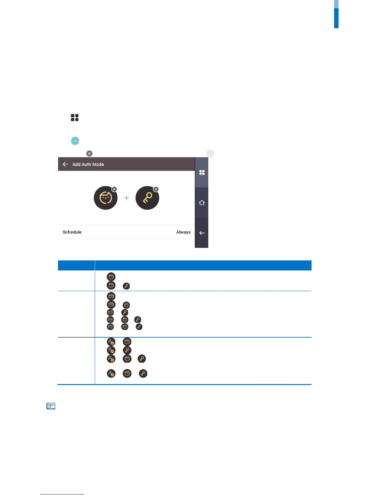 • + / : Mode allowing authentication with a card and then with a face or PIN.