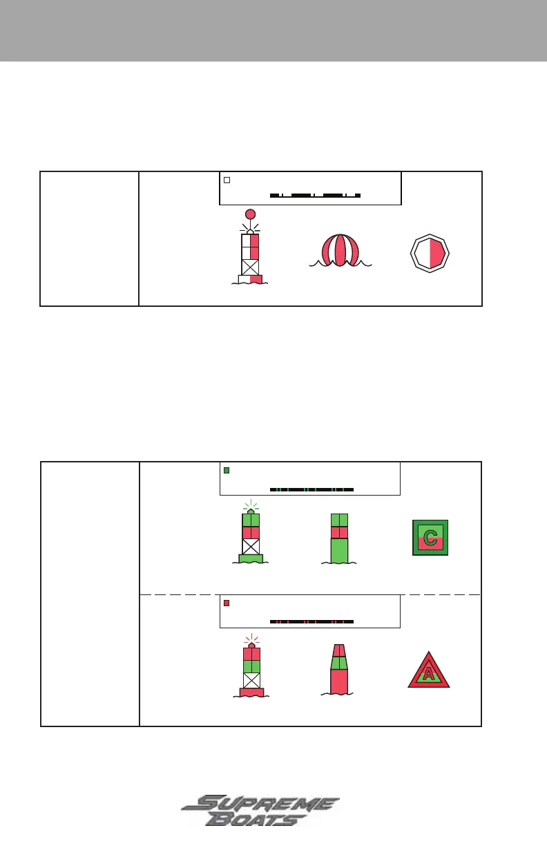 green horizontally striped can and nun-style buoys. The top band color indicates