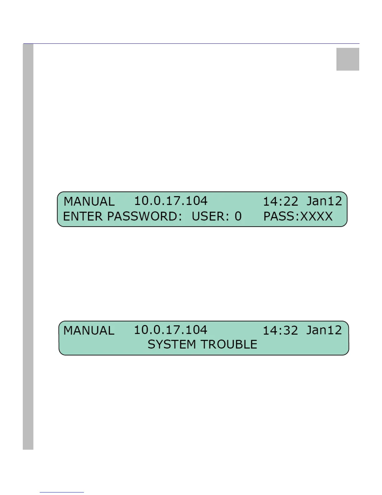 trouble list. The upper line displays the device mode (in the example below, ‘MANUAL’). The lower line displays the system information