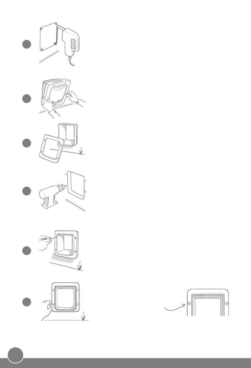 Ta bort husdjursluckan från hålet och borra fyra skruvhål