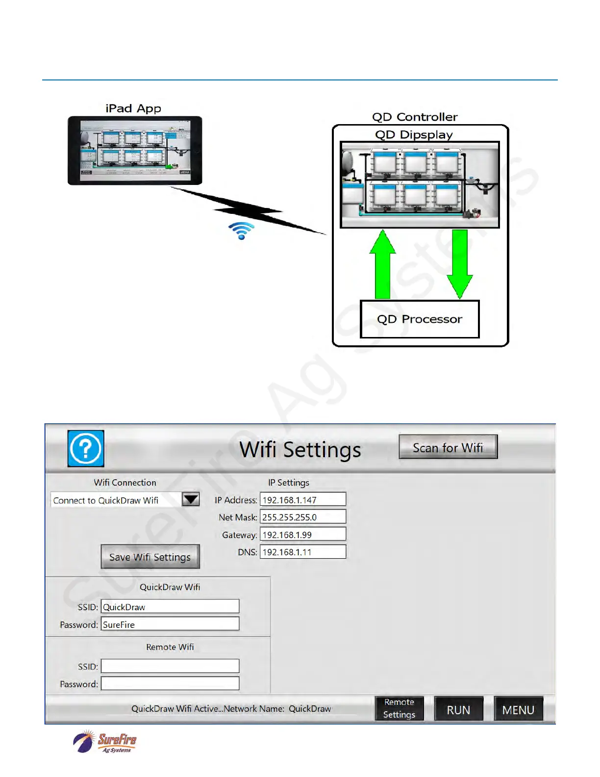 • Go to the Wifi Setup screen on the QD3000 controller via MENU->SETTINGS->Remote Settings-