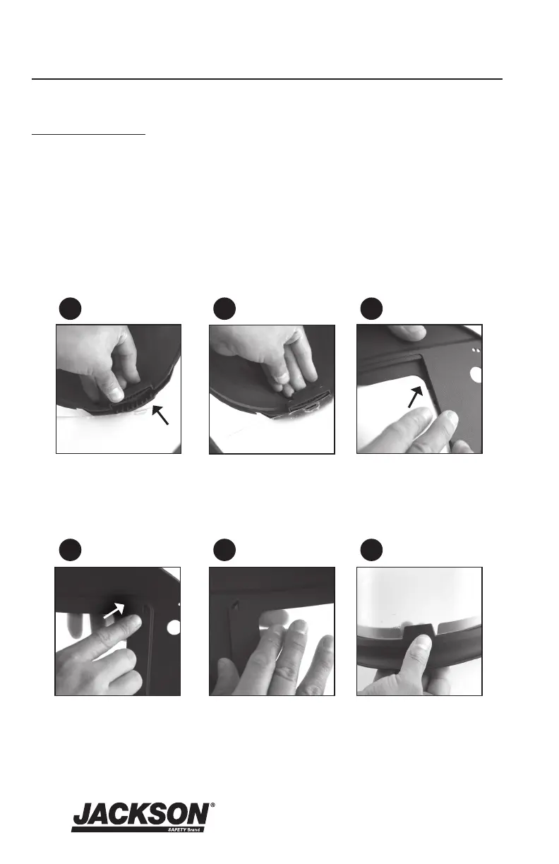4. Pull the chin guard downwards to place the window between the tabs as indicated on image (6).
