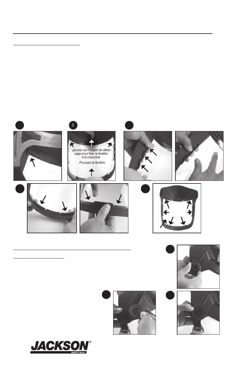 aux onglets inférieurs de la mentonnière (2). Vérifiez que le bas de la fenêtre est correctement fixé entre les