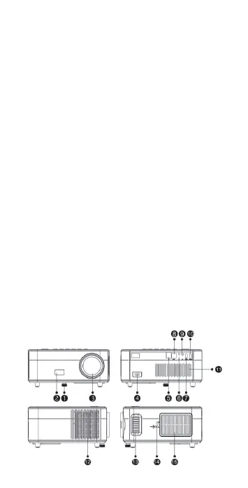 1.Adjustable tripod. 2. Remote control signal receiver. 3. Projector lens.